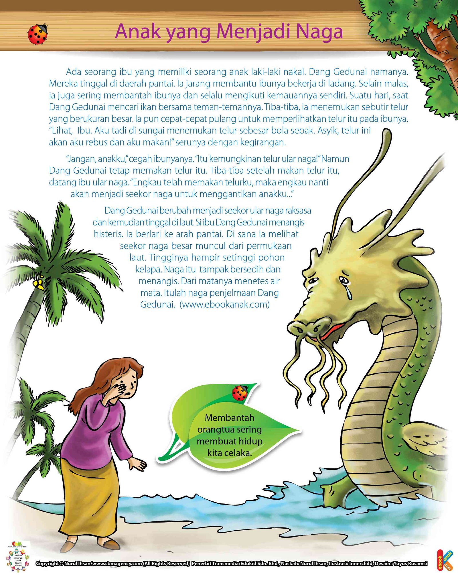 Ada seorang ibu yang memiliki seorang anak laki-laki nakal. Dang Gedunai namanya. Keduanya tinggal di daerah pantai. Dang Gedunai jarang membantu ibunya bekerja di ladang. Selain malas, Dang Gedunai juga sering membantah ibunya dan selalu mengikuti kemauannya sendiri. Suatu hari, saat Dang Gedunai mencari ikan bersama teman-temannya. Tiba-tiba, Dang Gedunai menemukan sebutir telur yang berukuran besar. Dang Gedunai pun cepat-cepat pulang untuk memperlihatkan telur itu pada ibunya. “Lihat, Ibu. Aku tadi di sungai menemukan telur sebesar bola sepak. Asyik, telur ini akan aku rebus dan aku makan!” seru Dang Gedunai dengan kegirangan. “Jangan, anakku,” cegah ibunya. “Itu kemungkinan telur ular naga!” Namun, Dang Gedunai tetap memakan telur itu. Tiba-tiba, setelah makan telur itu. Datang ibu ular naga ke tempat Dang Gedunai. “Engkau telah memakan telurku. Maka engkau nanti akan menjadi seekor naga untuk menggantikan anakku!” Maka dalam sekejap. Dang Gedunai berubah menjadi seekor ular naga raksasa dan kemudian tinggal di laut. Ibu Dang Gedunai menangis histeris. Ibu Dang Gedunai berlari ke arah pantai. Di sana Ibu Dang Gedunai melihat seekor naga besar muncul dari permukaan laut. Tingginya hampir setinggi pohon kelapa. Naga itu tampak bersedih dan menangis. Dari matanya menetes air mata. Ternyata, itulah naga penjelmaan Dang Gedunai. Hikmah Teladan Membantah orangtua akan membuat hidup kita kurang berkah dan mudah celaka. sumber : ebookanak. com